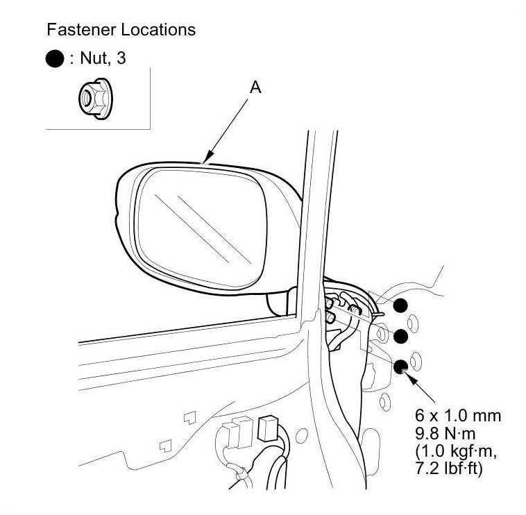 6. Remove the mirror (A) by pulling the threaded studs (B), the screw (C), and the wire harness (D) out through the holes in the door. Take care not to scratch the door or the mirror.