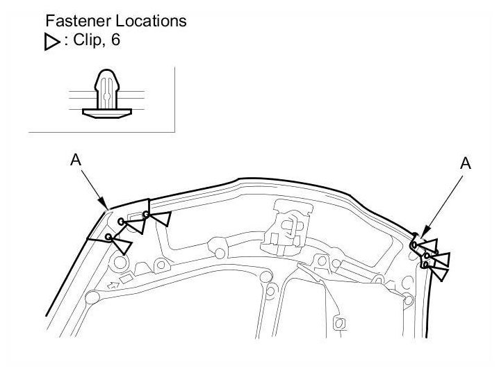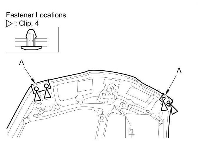 1. Detach the clips with a clip remover, then remove the hood seals (A).