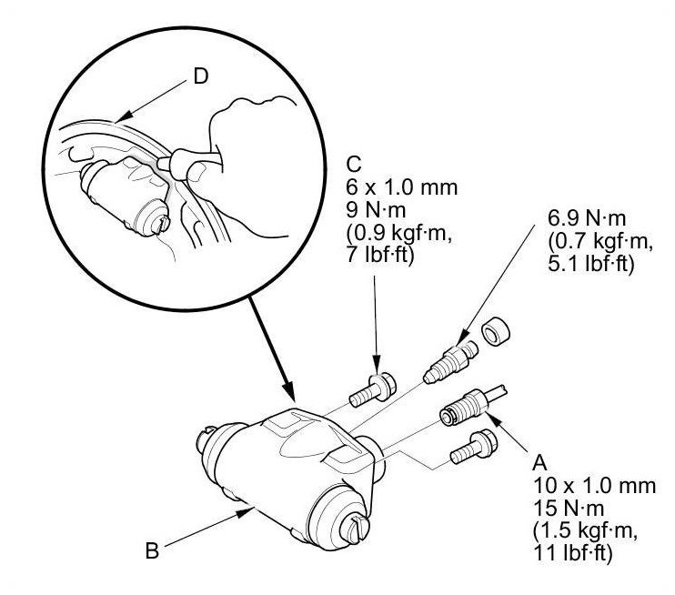 4. Apply Cemedine 366E sealant or equivalent between the wheel cylinder and backing plate (D), and install the wheel cylinder, then connect the brake line.