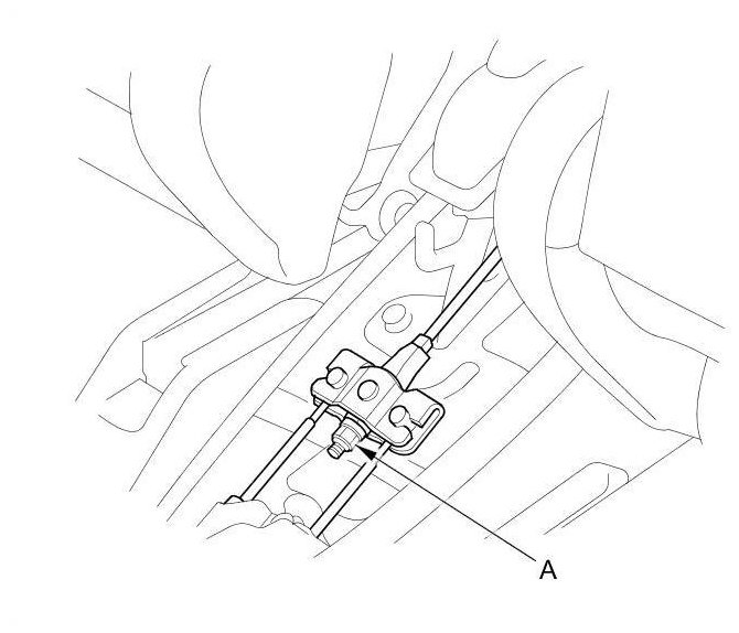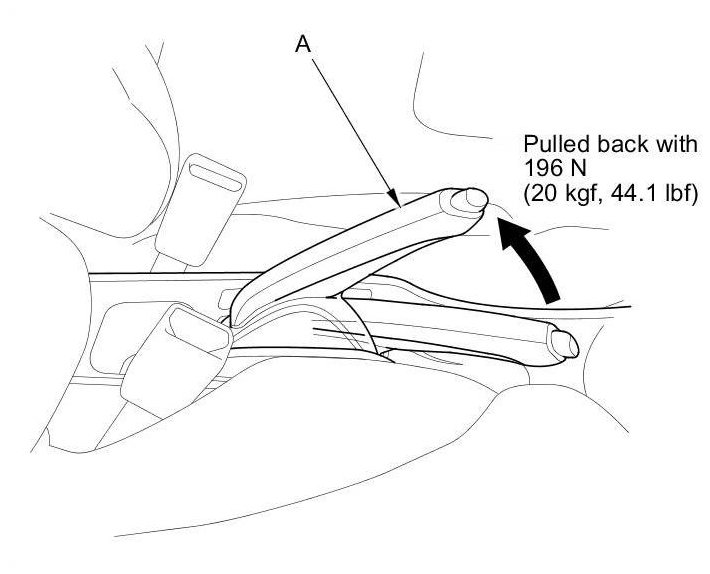 1. Pull the parking brake lever (A) with 196 N (20 kgf, 44.1 lbf) of force to fully apply the parking brake. The parking brake lever should be locked within the specified number of clicks.