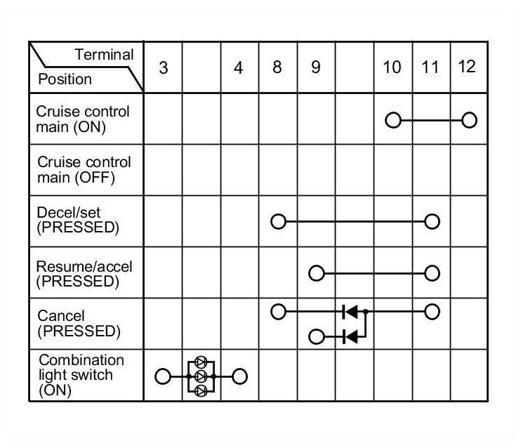 - If there is continuity, and it matches the table, but the cruise control combination switch failure occurred on the cruise control input test, check and repair the wire harness on the switch circuit.