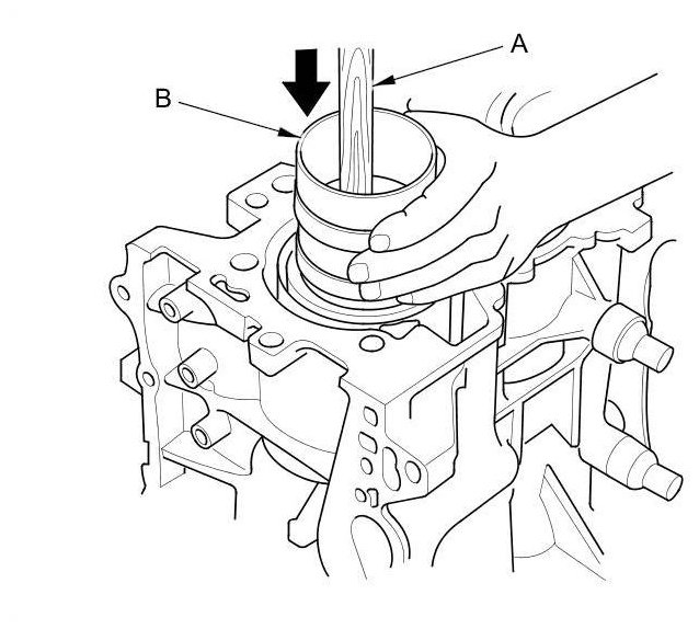 Maintain downward force on the ring compressor (B) to prevent the rings from expanding before entering the cylinder bore.