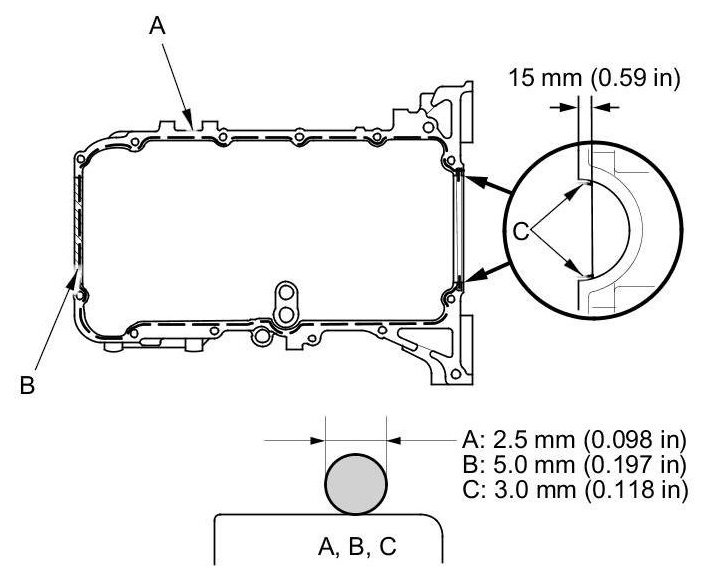 - Apply a 3.0 mm (0.118 in) diameter bead of liquid gasket along the broken line (C).