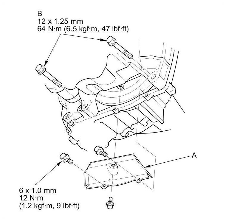 7. Install the clutch case cover/torque converter case cover (A), and install the transmission mounting bolts (B).