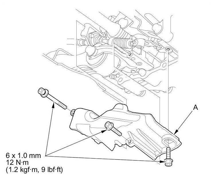 - Apply a 2.5 mm (0.098 in) diameter bead of liquid gasket along the broken line (A).