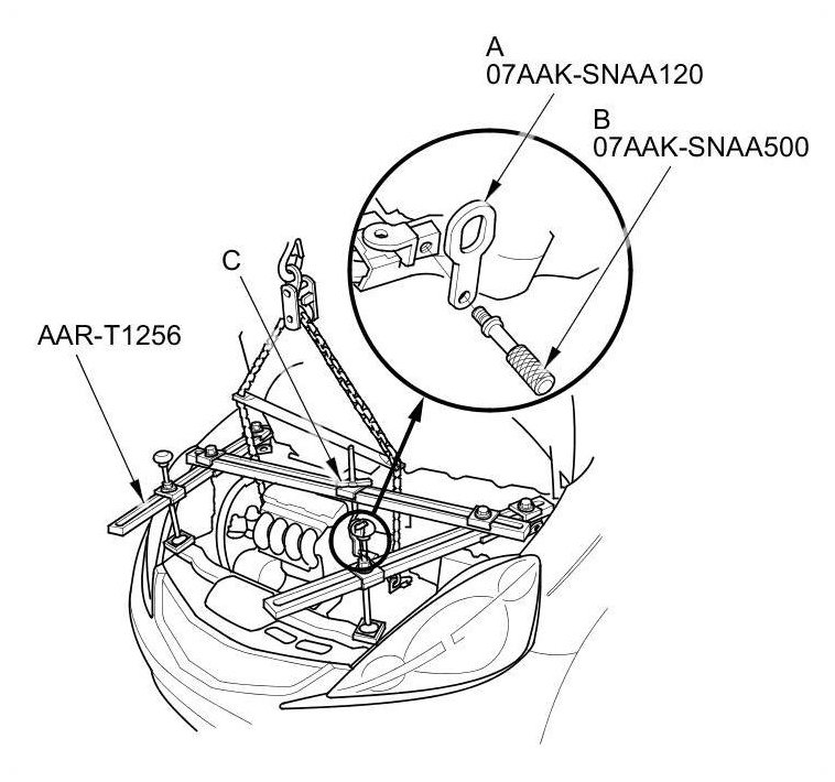 8. Install the engine support hanger (AAR-T1256), then attach the hook to the slotted hole in the second universal lifting eyelet. Tighten the wing nut (C) by hand to lift and support the engine/transmission.