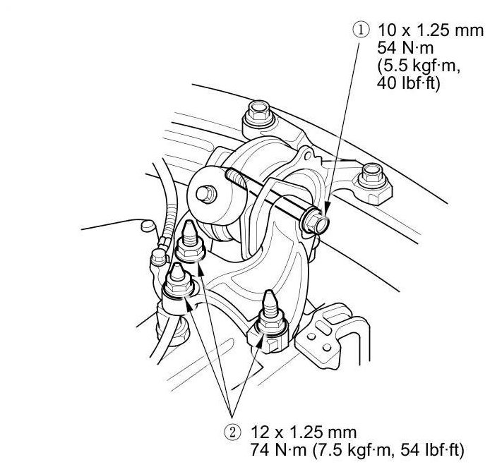 24. Tighten the torque rod mounting bolt and nut in the numbered sequence shown.