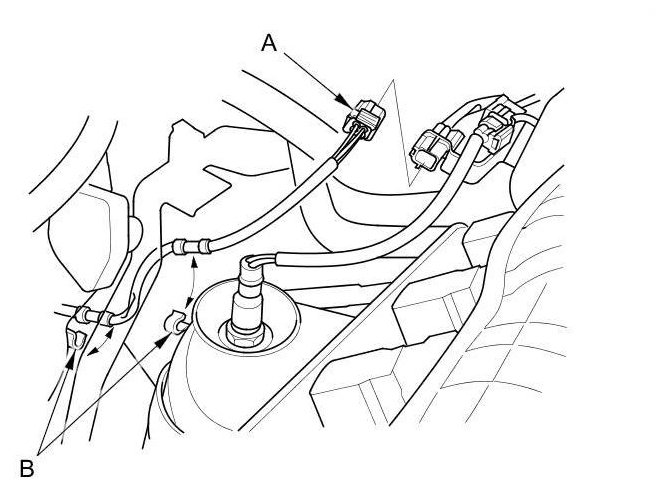 42. Connect the secondary HO2S connector (A), then install the secondary HO2S harness to the clamps (B).