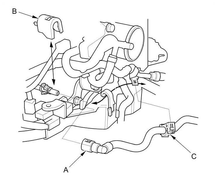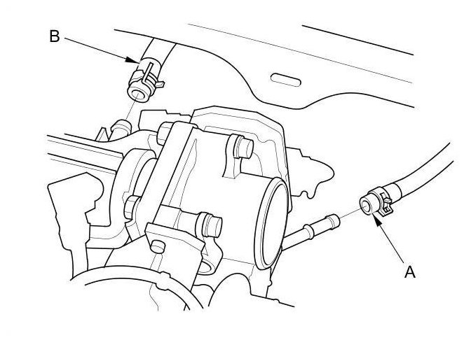 44. Connect the EVAP canister hose (A) and the brake booster vacuum hose (B).