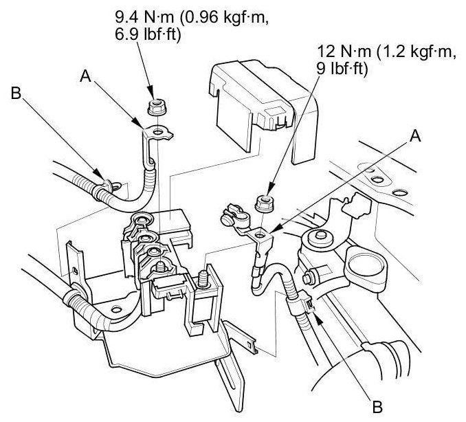47. M/T model: Install the battery base (A), then install the harness clamp (B).