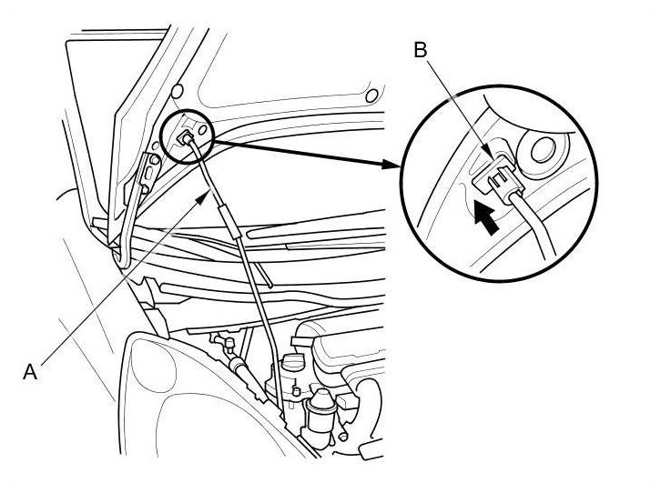 1. Open the hood, and secure it with the hood support rod (A) in the wide-open position (B).