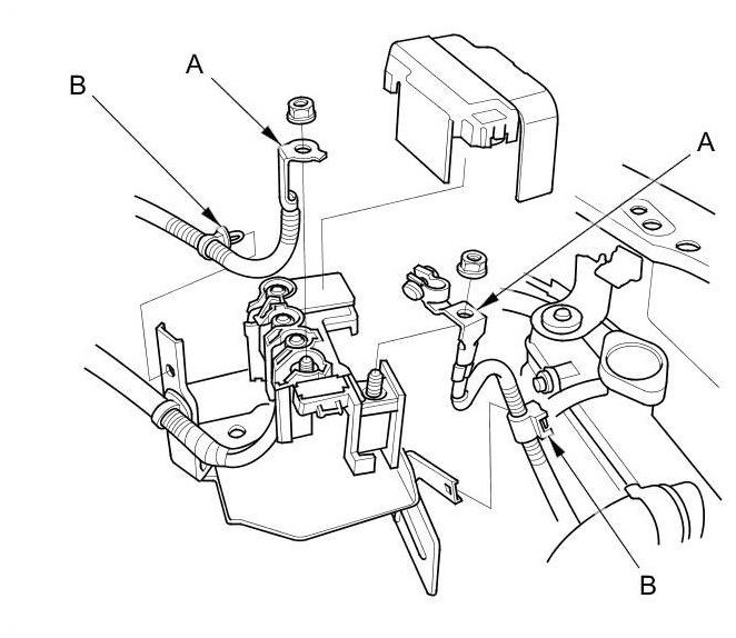 53. Remove the ground cable (A), then remove the side engine mount/bracket assembly (B).
