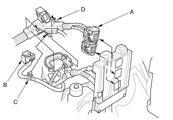 10. Disconnect the ECM/PCM connectors (A) and the engine wire harness connector (B).