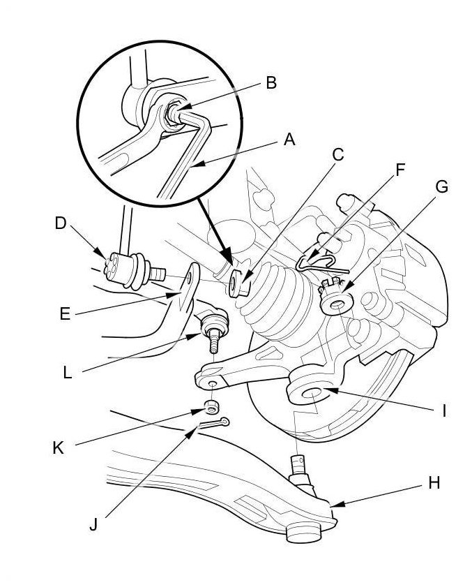 31. Remove the spring clips (F) and castle nuts (G), and separate the lower arms (H) from the knuckles (I) Service and Repair.