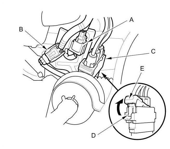 36. Disconnect the EPS motor 3P connector (C) by pushing the lock (D) and pulling up the lever (E).