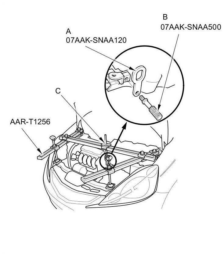 42. Install the engine support hanger (AAR-T1256), then attach the hook to the slotted hole in the first universal lifting eyelet. Tighten the wing nut (C) by hand to lift and support the engine/transmission.