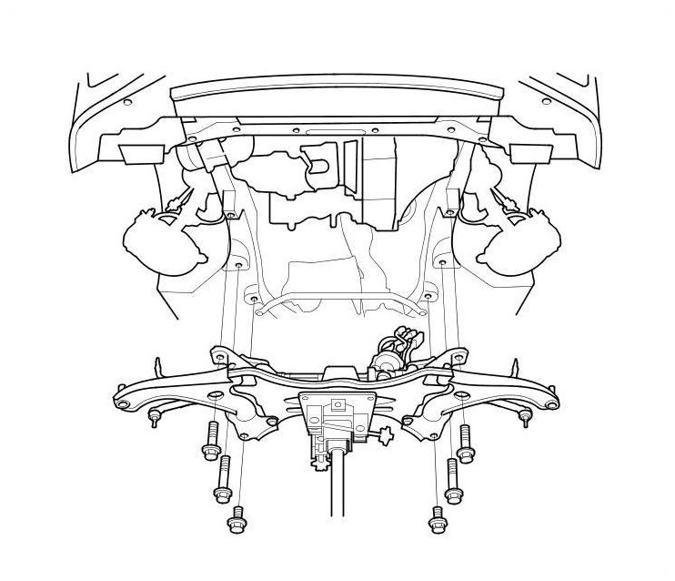 46. Support the front subframe with a transmission jack and a wood block under the front subframe.