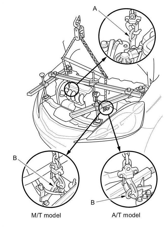 51. Attach the chain hoist to the second universal lifting eyelet (A) and the transmission hook (B). Lift the engine/transmission until it is securely supported by the chain hoist, then remove the engine support hanger.