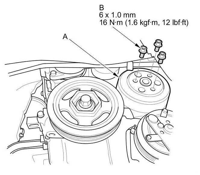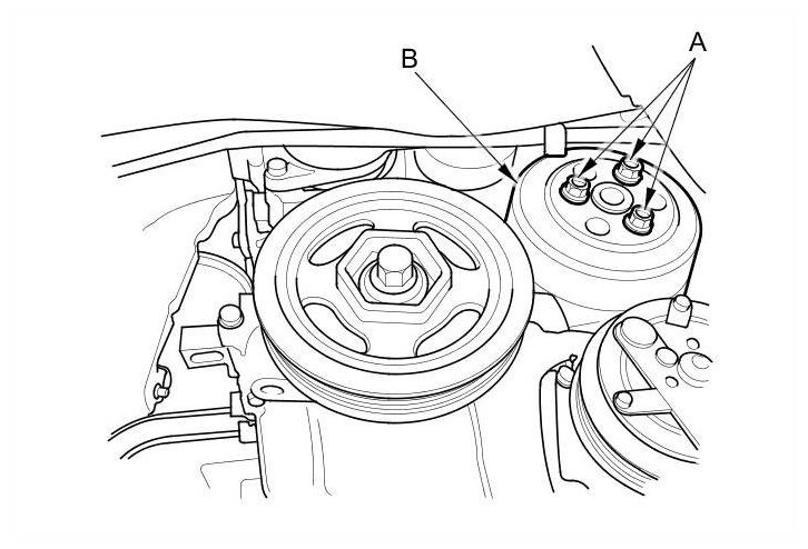 5. Remove the water pump pulley mounting bolts, then remove the water pump pulley (B).