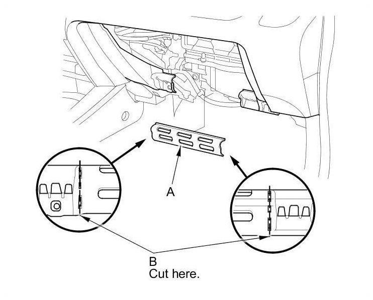 4. Cut the plastic cross brace (A) in the glove box opening with diagonal cutters in the area (B). Remove and discard the plastic cross brace.