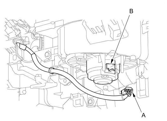 7. Remove the connector clip (A), the self-tapping screws and the mounting nuts, then pull the blower unit (B) out.