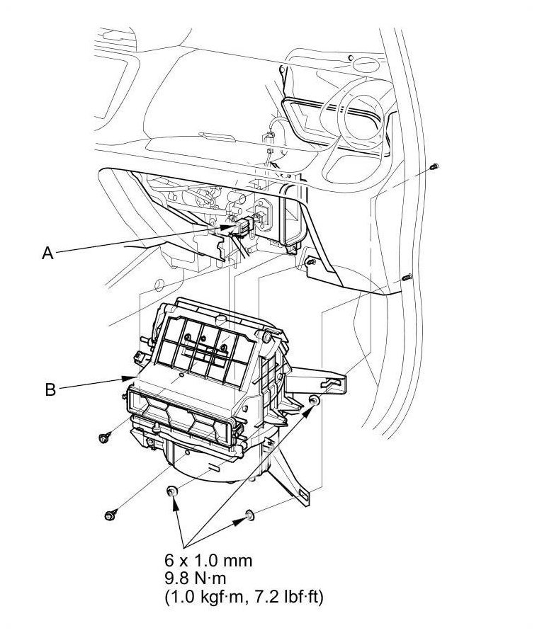 6. Remove the self-tapping screws and the harness clip (A), then remove the passenger's heater duct (B).