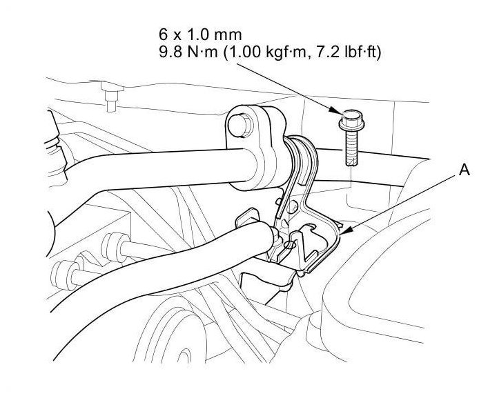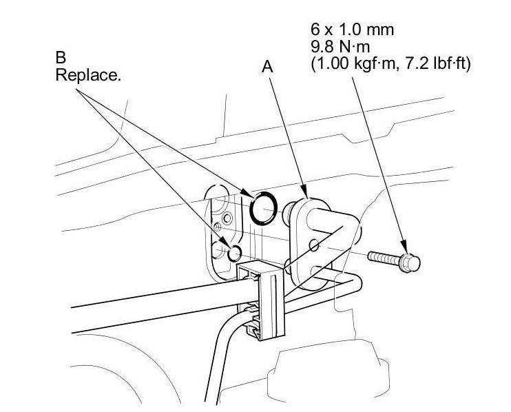 4. Remove the bolt, then disconnect the A/C line (A) from the evaporator core and remove the O-rings (B).