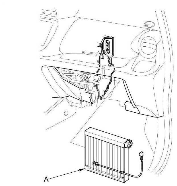 9. Reinstall the evaporator temperature sensor (A). If the evaporator is new, install the sensor on the 6th row of fins, counting from the side opposite the expansion valve. If you are reinstalling the old evaporator, install the sensor on the 7th row of fins.