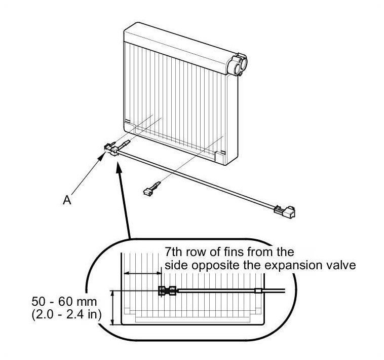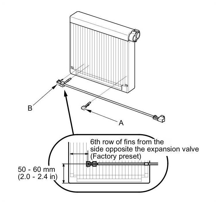 NOTE: At the factory, the evaporator temperature sensor is installed at the 6th row of fins from the side opposite of the expansion valve.