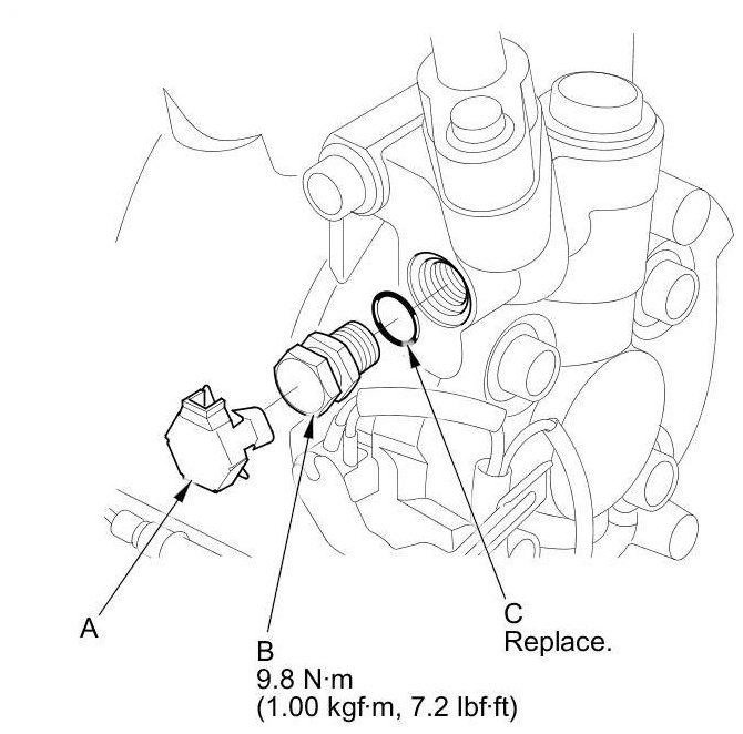 2. Remove the relief valve cover (A), the relief valve (B), and the O-ring (C). Plug the opening to keep foreign matter from entering the system and the A/C compressor oil from running out.
