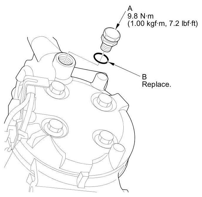 2. Remove the relief valve (A) and the O-ring (B). Plug the opening to keep foreign matter from entering the system and the A/C compressor oil from running out.