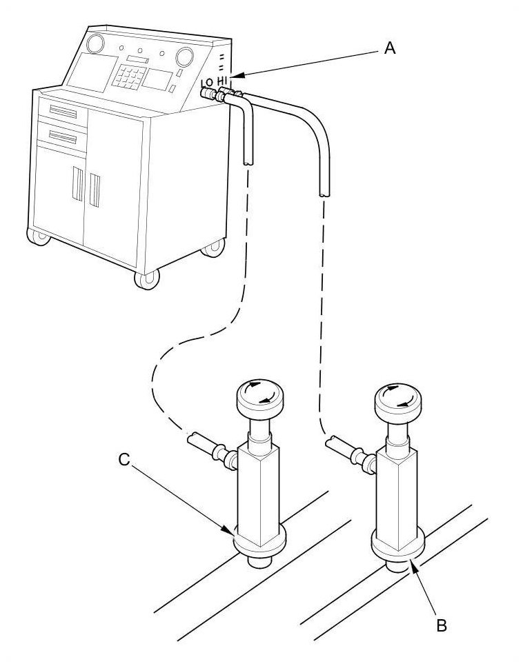 1. Connect an R-134a refrigerant recovery/recycling/charging station (A) to the high-pressure service port (B) and the low-pressure service port (C), as shown, following the equipment manufacturer's instructions.