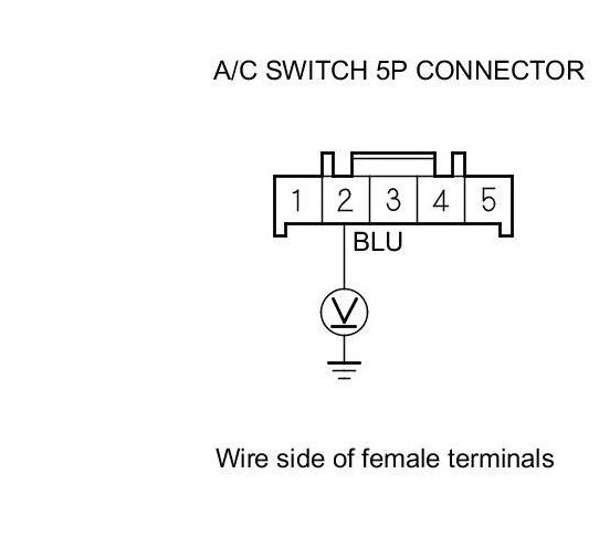 9. Measure the voltage between A/C switch 5P connector terminal No. 2 and body ground.