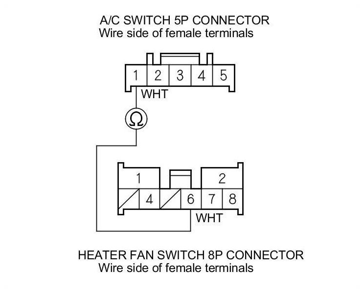 13. Check for continuity between A/C switch 5P connector terminal No. 1 and heater fan switch 8P connector terminal No. 6.