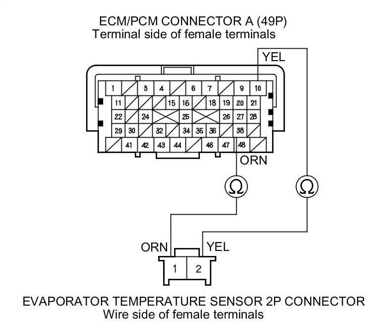 18. Check for continuity between the following terminals of ECM/PCM connector A (49P) and the evaporator temperature sensor 2P connector.