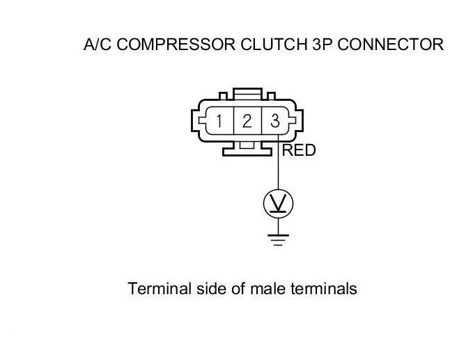 24. Measure the voltage between A/C compressor clutch 3P connector terminal No. 3 and body ground.