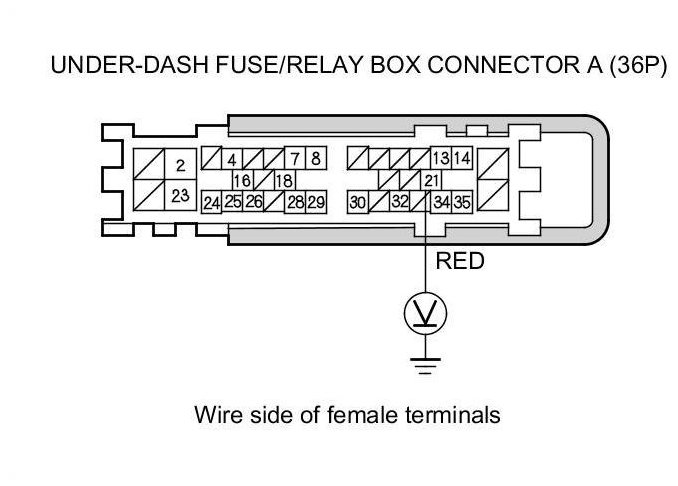 31. Measure the voltage between under-dash fuse/relay box connector A (36P) terminal No. 21 and body ground with the under-dash fuse/relay box connectors connected.