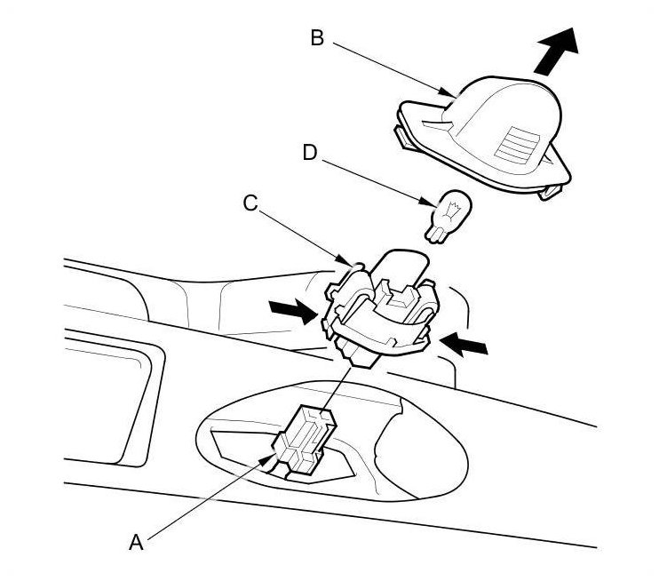 3. Separate the license plate light lens (B) and the housing (C), then remove the bulb (D).