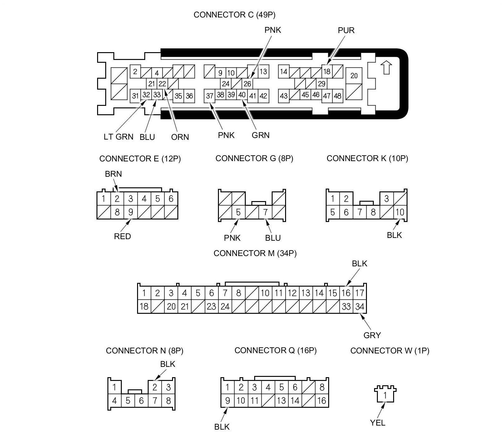 3. Disconnect the under-dash fuse/relay box connectors C, E, G, K, M, N, Q, and W.