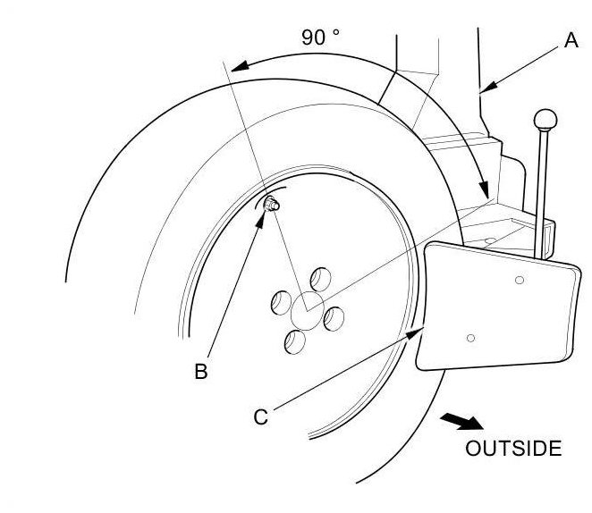 - Position the wheel as shown so the valve stem (B) is 90 degrees from the bead breaker (C) as shown.