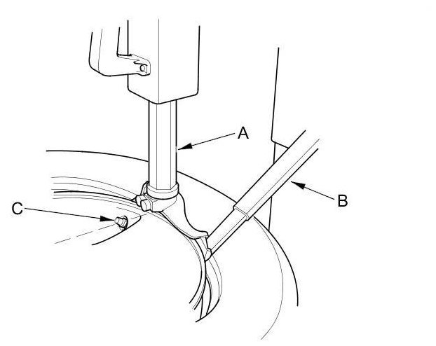 5. Position the wheel so the tire machine (A) and tire iron (B) are next to the valve stem (C) and will move away from it when the machine starts. Then remove the tire from the wheel.