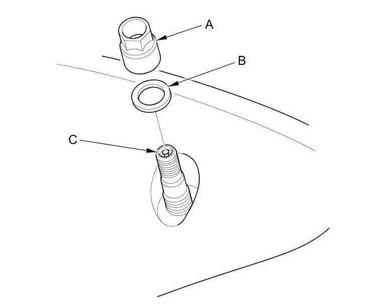 6. Remove the valve stem nut (A) and the washer (B), then remove the tire pressure sensor with the valve stem (C) from the wheel.