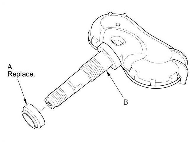 7. Remove and discard the valve stem grommet (A) from the tire pressure sensor (B).