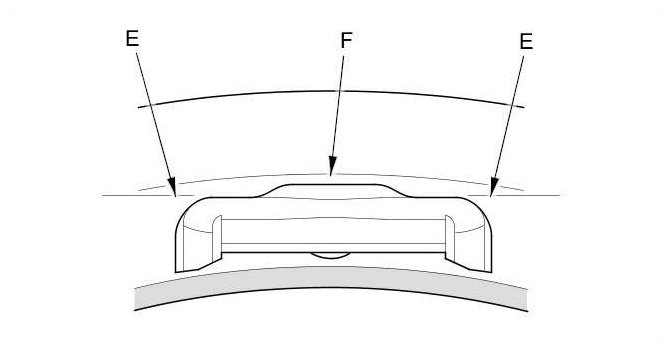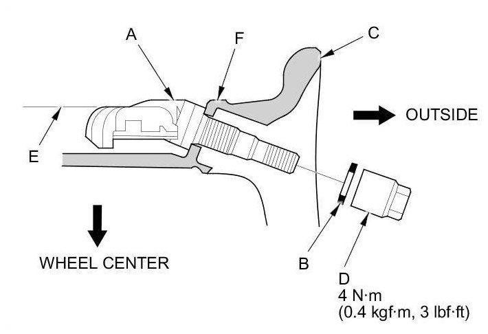 NOTE: Install the tire pressure sensor so that the sensor housing surface (E) does not extend beyond the protrusion (F) on the wheel to prevent the sensor housing from being caught on the bead of the tire when assembling the tire.