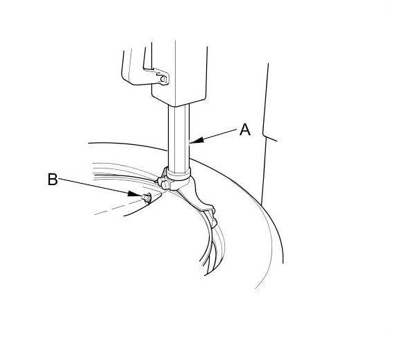 4. Lube the tire bead sparingly with a paste-type tire mounting lubricant, and position the wheel so the tire machine (A) are next to the valve stem (B) and will move away from it when the machine starts. Then install the tire onto the wheel.