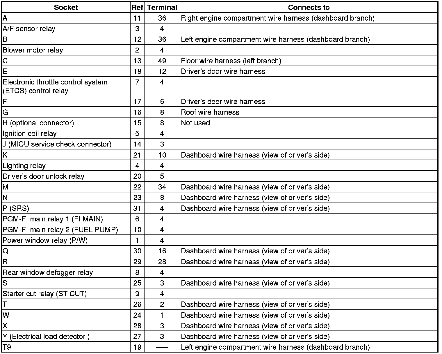Fuse/Relay Box Connector Locations (Under-dash Fuse/Relay Box)