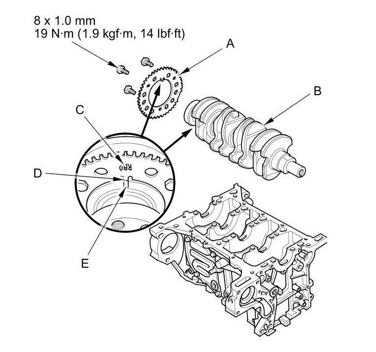 3. Install the CKP pulse plate on the crankshaft; face the marked side (C) toward the transmission, and align the tab (D) on the CKP pulse plate with the groove (E) on the crankshaft.
