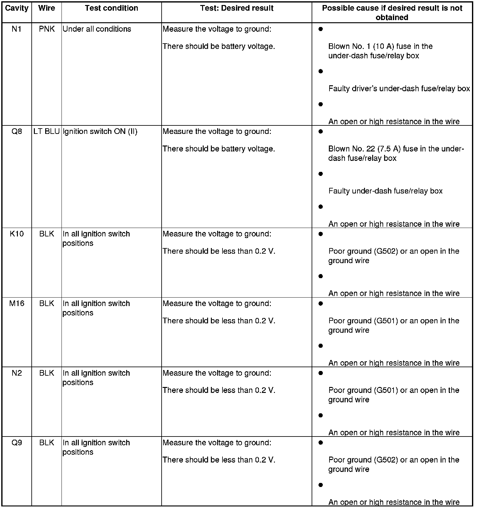 6. Reconnect the connectors to the under-dash fuse/relay box, turn the ignition switch to ON (II), and do these input tests at the following connectors.