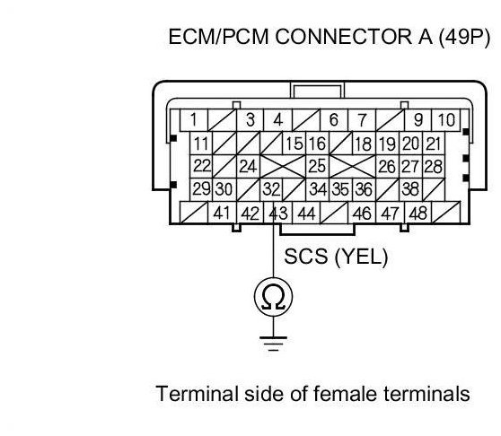 7. Check for continuity between ECM/PCM connector terminal A32 and body ground.
