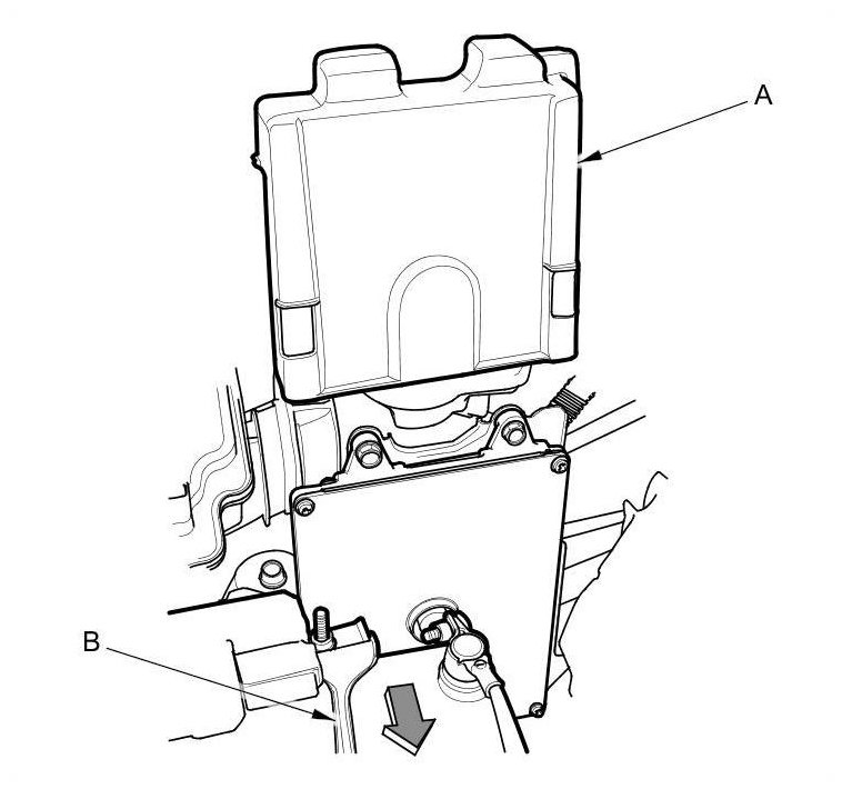 9. Remove the battery setting plate (B), then reposition the battery away from the ECM/PCM.